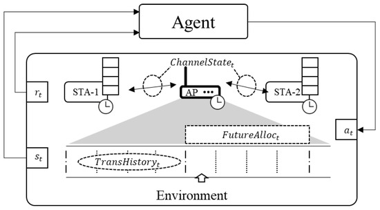 The channel state information can be obtained from the physical layer, and it is assumed that the AP periodically acquires channel state information through communication with the nodes [43]. The information captures the current MCS index for the link state of each node, allowing the agent to adjust its scheduling decisions based on the condition of in Equation (15), taking into account changes in transmission rates. The represents the scheduled transmission plan, indicating the node IDs and the number of frames that each node is scheduled to transmit in each slot for the next i steps, including step t. This information helps the agent learn the TS stream pattern. The third component of , , is the history of frames transmitted in the past, which the RL agent uses to reference past transmission data and perform actions at step t. The has a size of N by i (the number of past steps to be observed).