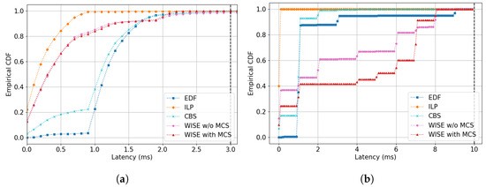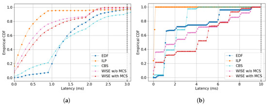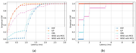 ECDF graph of latency in Scenario 3: (a) Stream Type A. (b) Stream Type B.