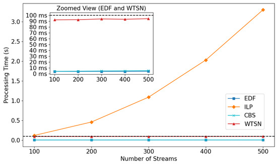 In this section, the processing time of the WISE algorithm was evaluated by comparing it with other algorithms as the number of streams increased. In this experiment, the stream sets were randomly generated with 100, 200, …, up to 500 streams. The configuration of the WTSN network and the stream types present within the network were identical to previous experiments, with two streams each of ST1 and ST2.