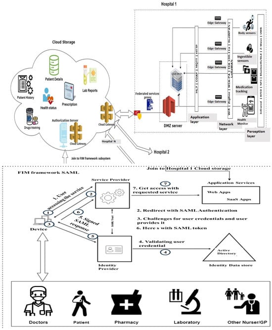 The proposed approach considers a Federated Identity Management (FIM)-based hospital framework with connected IOMT and MCPS devices. Figure 1 presents the FIM-based hospital framework. Hospital 1: As shown in Figure 1, the top parts of the upper section present the IoMT and MCPS, which are connected to the hospital LAN through the edge gateways, and then edge gateways are connected to the cloud computing network via the DMZ server. The DMZ server and edge gateway sub-networks are properly segmented and segregated by rule-sets to restrict external access to the sensitive IoMT and MCPS devices. On the upper-left side, the hospital network is connected with the cloud network for data storage and running different application services. DMZ protects the hospital’s internal local-area network (LAN) from untrusted traffic. It generally acts as a sub-network between public internet and private networks. It protects the data and filter traffic on the internal networks by providing an extra layer of security using firewalls. The lower section presents how the FIM is implemented. The FIM can use either Security Assertion Mark-up Language (SAML) or OAuth [].