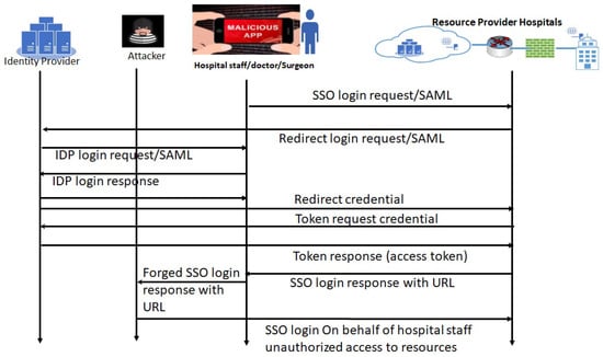 1.1 Attack sequence analysis for SAML vulnerabilities in a hospital’s FIM framework: SAML vulnerabilities can be exploited when hospital staff use their mobile management systems/applications under the FIM framework to access resources in other hospitals/clinics. The clinician logs in to an application using their mobile device, which may already have malicious applications installed. This analysis approach has been explained in the sequence diagram (Figure 3). As we can see in Figure 3, the login credentials or SAML login response with URL are forged by the attacker via the malicious apps in the mobile device. The attacker can use those to access the resources.