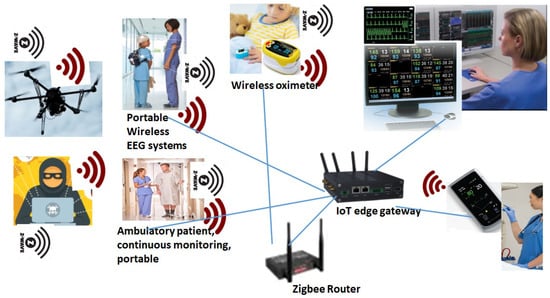 IoMT devices, such as portable wireless EEG devices (Nihon Kohden airEEG system), are used for long-term routine EEG monitoring, and also in ICU environments. Patient monitoring devices, such as GZ-120 portable patient monitoring, are used to monitor ambulatory vital signs, including ECG and respiration rate. Several other perception layer devices, which carry ambulatory signals such as ECG, EEG, and heart, include NTX/ZM-540/541PA and ZM-530/531PA Nihon Kohden. The corresponding nurse station central monitoring system, such as Nihon Kohden Defensive Monitoring systems, are connected through a number of IoT protocols, including Zigbee, z-wave, WiFi, and RF, as mentioned in Figure 5.