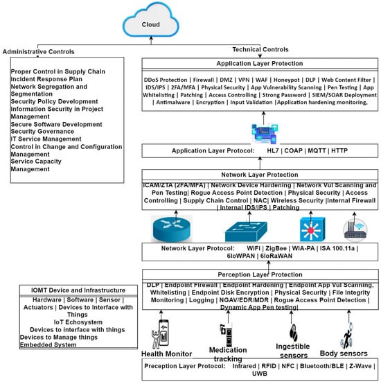 The risk treatment columns in Table 3, Table 4, Table 5 and Table 6 present the required security controls for each identified risk. Administrative controls are deployed by establishing security governance. Executive management will be closely engaged in implementing administrative controls. Technical controls for risk treatment are deployed in a layer-wise manner for the perception layer, network layer, and application layer. This will mitigate the risk posed on IoT hardware and software to an acceptable level. In the connected digital healthcare system, both administrative and technical controls are required for a smooth operation (Figure 15).