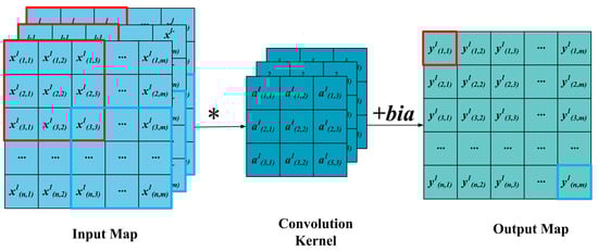 As a type of machine learning, convolutional neural networks (CNNs) are inspired by the neurons in the visual nervous system [26]. They play a pivotal role in the domain of deep learning algorithms. As feedforward neural networks, CNNs can extract features efficiently and reduce the computational load of the network model through local weight sharing and sparse connectivity [27]. A typical CNN structure is composed of a convolution layer, a pooling layer, and a fully connected layer. Among them, the convolution and pooling layer are typically connected in an alternating manner, and the fully connected layer is composed of several multi-layer perceptrons [28]. During the operation of the convolution kernels, they scan the input features and sum them by multiplying the matrix elements and adding the bias within the receptive field. The operation of the convolution layer is illustrated in Figure 1, and the mathematical description is provided as follows: