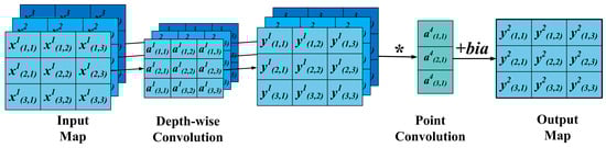 As a variant of CNN, depth-wise separable convolutions (DWSCs) include depth convolution and point convolution [29], which can reduce the computational complexity and space complexity of each convolutional layer. The workflow of DWSC is shown in Figure 2, and the output can be calculated as follows: