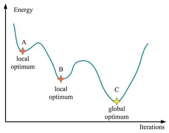 One advantage of SA is its capacity to escape local optima, thereby demonstrating high efficacy and global search capabilities for complex optimization problems. According to Figure 5, as the number of iterations increases, the SA algorithm initially identifies the local optimum at point A. It then continues to calculate, discovering that point B has a lower energy value and updating the optimal solution to point B. Iteratively, the algorithm finds that point C has even lower energy than point B. With no lower energy found in subsequent iterations, point C is identified as the global optimum.