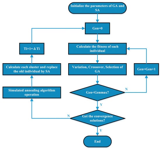The simulated annealing (SA) algorithm was proposed by Metropolis et al. in the 1950s. The fundamental principle of SA is based on the metallurgical annealing process in physics [32]. Initially, the metal material is heated to a specific temperature to melt it. Afterward, the material is cooled into a solid, forming a regular microstructure to minimize internal energy. When heated, the particles inside the solid continuously accelerate and move non-uniformly due to the increase in temperature, resulting in an increased internal energy. As the temperature decreases, they decelerate and tend to become ordered, reaching equilibrium at a specific temperature. Once ambient temperature is reached, the particles attain their lowest internal energy state and achieve thermal equilibrium. The fundamental principle of the SA algorithm is that it can accept a solution inferior to the current one with a certain probability P, in accordance with the Metropolis sampling rule [33]. This enables it to escape from a local optimal solution and to identify the optimal solution amongst all possible solutions. The cooling equation can be expressed as follows: