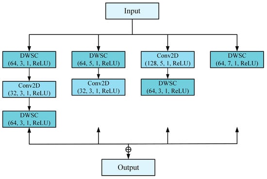 In this structure, both depth-separable convolution and standard convolution are used. The sizes of the kernels in the four channels are three consecutive 3 × 3 kernels, two consecutive 5 × 5 and 3 × 3 kernels, and one 7 × 7 kernel. The softmax function is connected in the model output layer to achieve classification.