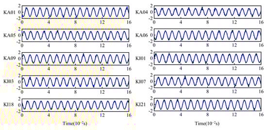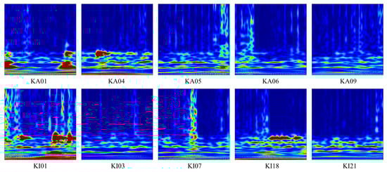 In this paper, the CWT time–frequency images and motor current signal are used as the inputs to the model. CWT is a widely used time–frequency analysis method that provides detailed information about a signal at various frequencies and times. Compared to the other methods, CWT offers better discrimination power and resolution. Meanwhile, it is suitable for nonstationary signals, such as the impact signal and seismic signals Therefore, it is used to analyze the bearing vibration signal. However, current spectrum analysis is affected by inherent harmonics, resulting in the incomplete time–frequency analysis of the motor current signal. Therefore, the motor current signal is used directly. Each fault sample contains 1024 sampling points, with 300 samples generated for each fault type, totaling 3000 fault samples. Meanwhile, a 200-point interval is employed to increase the sample diversity. The input signals are shown in Figure 11 and Figure 12, respectively.