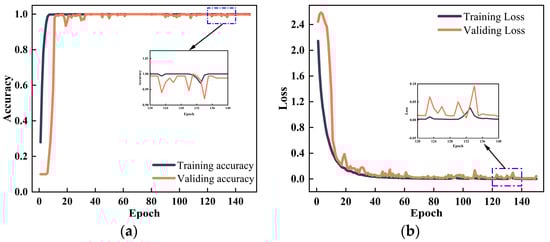 (a) The accuracy of the training set and validation set; (b) the loss values of the training set and validation set.