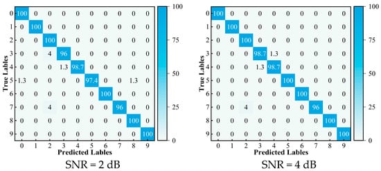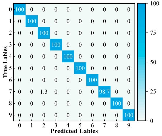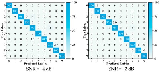In order to further illustrate the effectiveness and the feature learning capability of the method under various SNRs, the confusion matrices are generated utilizing the diagnosis results for −4 dB, −2 dB, 2 dB, and 4 dB. The results are depicted in Figure 18. Here, the horizontal axis represents the predicted label, and the vertical axis represents the actual label. For instance, in a −2 dB noise environment, the diagnostic accuracy exceeds 98% for all the categories except 3 and 4. Specifically, the accuracy for category 3 is 97.4%, for category 4 is 96%, for category 7 is 98.7%, and for the other categories is 100%. In summary, the confusion matrix visualization further demonstrates the high diagnostic accuracy of the GASA-MSCNN model across various categories and provides more reliable results.