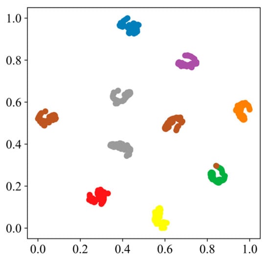 The diagnostic results of the validation data are shown in Figure 15. As shown in the confusion matrix in Figure 15, the overall accuracy is relatively high. For some fault types, the recognition rate reaches 100%, but there are also some errors. For example, label 7 is misclassified as label 2, identifying the inner ring electric engraving machine level 2 fault as the outer ring electric engraving machine level 1 fault. The reason for this phenomenon may be that the weight distribution in the GASA-MSCNN cannot sufficiently distinguish their features, leading to classification errors. To further demonstrate the effectiveness of the GASA-MSCNN, Figure 16 shows the T-SNE visualization of the final output results. The results show that the data points of the same type gradually cluster in the final classification. Except for some overlapping regions, the remaining fault types are completely separated, achieving good classification results. These results are consistent with the confusion matrix and establish accurate mapping relationships between the defect types and features. This demonstrates that the method performs well after training and proves that the GASA-MSCNN can achieve a strong diagnostic performance regarding rolling bearings.
