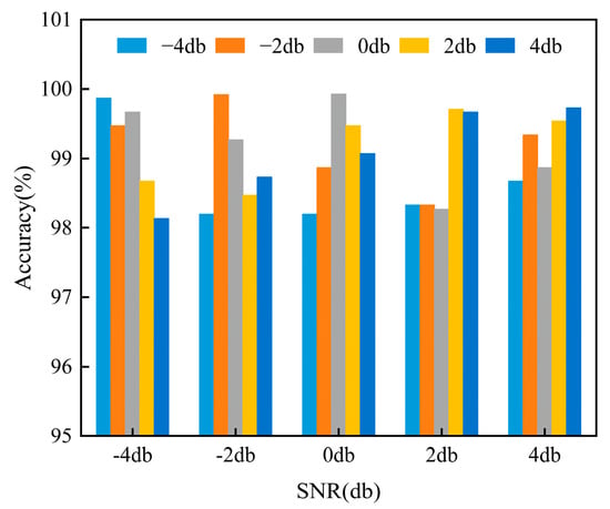 The experimental results under variable noise environments are depicted in Figure 17. Apparently, the diagnostic performance of the proposed method is above 98% under different SNRs. Specifically, the fault diagnosis accuracy is 99.87% and 99.92% in strong noise environments with SNRs of −4 dB and −2 dB, respectively. This indicates that the proposed method maintains high fault diagnosis capability even in strong noise environments. For example, in the −2 dB noise environment, the lowest diagnostic accuracy is 98.2% when −4 dB noise is the target domain, and the highest diagnostic accuracy is 99.92% when −2 dB noise is the target domain. The accuracy difference between the two diagnostic results is 1.72%, and the average diagnostic accuracy is 98.92%, indicating that the proposed method still has the ability to identify fault conditions even under noise.