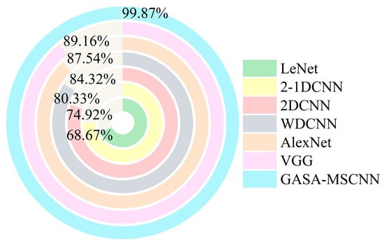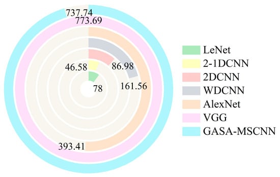 To further verify the performance of the proposed method, it was compared with several widely used methods (VGG, LeNet, AlexNet, etc.) under the same conditions as GASA-MSCNN. These methods include those that use CWT time–frequency images alone, those that rely solely on vibration signals, and those that combine both vibration and current signals. The accuracy and training time of the experiments are summarized in Figure 19 and Figure 20, respectively. In terms of the diagnostic results, LeNet had the lowest accuracy at 68.6%, followed by 2-1DCNN at 74.92%. The diagnostic accuracies of AlexNet and VGG were 87.54% and 89.16%, respectively. However, compared to the GASA-MSCNN model, the diagnostic accuracies of these methods are still lower than 99.87%. Among the comparison models, VGG achieved the highest diagnostic accuracy but also had the longest diagnostic time, approximately 773.69 s. Moreover, 2-1DCNN had the shortest diagnostic time, 46.58 s, but its accuracy was only 74.92%. Although the proposed method has a relatively long training time, it achieves high diagnostic accuracy. This demonstrates that the proposed method offers the highest detection accuracy and is clearly superior to the other diagnostic methods.