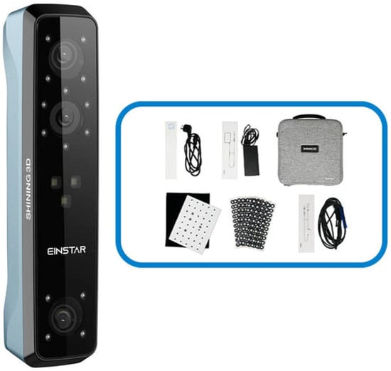 The EINSTAR scanner and accessories (source: https://www.einstar.com/products/prosumer-portable-3d-scanner?variant=43551575507118%20%2Fedition%2F20240814.html) (accessed on 6 August 2024).