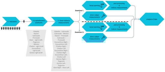 Eleven volunteers were enrolled for this study, six of them female and the five male. Their age ranged between 18 and 58 years (mean = 31). The sample size was calculated based on a previous study. Basier Ngueira et al. evaluated the accuracy of a new photogrammetric scanner using 11 participants and found that it produced facial measurements with high intra- and inter-examiner reliability (ICC > 0.9) and a minor variation of less than 2.0 mm, except for three measurements. The 3D cloner scanner demonstrated clinically acceptable accuracy, comparable to a digital caliper, with a mean difference of −0.8 ± 1.2 mm [31]. Exclusion criteria were history of either unilateral or bilateral facial procedures, surgery, trauma, or congenital conditions that could alter facial anatomy [31].