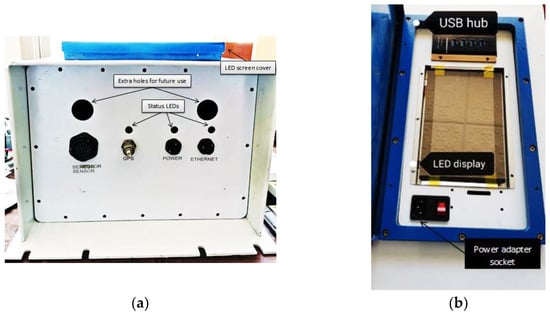 Figure 2a shows the front panel for the system. The front panel consists of 4 main connectors: sensor, global positioning system (GPS), power, and ethernet. These connectors are military sockets. The sensor connector contains a 26-pin connector that should be connected to seismometer via cable. This connector has availability to take readings from sensors in three directions: north-south (y-axis), east–west (x-axis), and vertical (z-axis). Then, measuring signal is directed to the front-end circuit. GPS connector connects the GPS receiver to the GPS antenna. Power socket is the main supply to the system boards with 12 V DC from solar batteries. Ethernet socket is to enable user to access the prototype locally using web browser or remotely over a TCP/IP connection. Status LEDs function is to give user notifications about power, ethernet, and timing status. Two extra holes are drilled for any future use. From the top view, there is an upper cover for the prototype top part such as projective capacitive (P-CAB) touchscreen display. The enclosure is designed to follow IP67 rating. The prototype top view is illustrated in Figure 2b. The user can configure and monitor ground motion records via P-CAB touch screen. The USB hub is connected directly to the microprocessor for data retrieval. The system has two power sources: 1. solar battery, and 2. power socket. The power adapter socket can feed system with power directly from electricity (110–240 V) and can be converted to 12 V using power adapter that is located inside the system casing. All electronic boards inside the system need 12 V to be turned on.