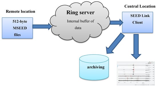 After converting the data to MiniSEED format, they need to be stored and transmitted to the end user. The ring server is designed for streaming data packets based on TCP/IP connection. The ring buffer operation follows a first-in–first-out (FIFO) scheme. Thus, new packets will be transmitted after older packets being transmitted. Although the ring buffer supports many data types, it is preferable to use MiniSEED format to ensure stability and scalability. TCP/IP connections are used for SeedLink communication with default port equal to 18,000. The SeedLink protocol enables robust data communication between remote location (station) and central location where packets have standard packet size of 512-byte MiniSEED records. The SeedLink protocol inserts MiniSEED packets into the ring buffer. The ring buffer is a memory-mapped storage. Finally, programs such as Seiscomp3 or Earthworm in the central hub can connect to a ring server over the SeedLink protocol for data archiving and processing, as shown in Figure 3. Also, data are stored internally in the microprocessor hard drive for data extraction via USB port in case of offline mode.