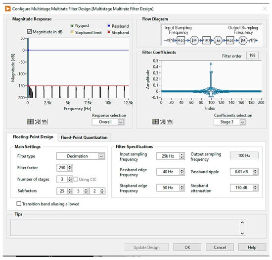 The output sampling frequency is configured according to the user application. This is achieved using a multistage filter design function in LABVIEW (version 21), as shown in Figure 4. The main settings of the filter design are the filter type, number of decimation stages, and decimation factors.