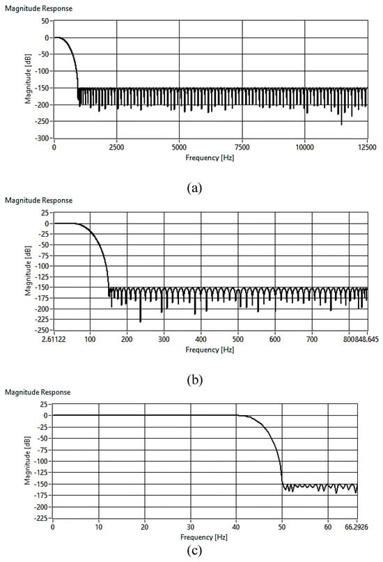 The user can configure the filter specifications including the input sampling frequency, the passband and stopband frequencies, passband ripple, and stopband attenuation. Therefore, the digitizer is scalable to generate a wide range of different rates. Three sequential filters were designed to decimate the input sampling rate to the desired one. According to sampling theory, it is required to sample the signal with a rate that is greater than twice the signal maximum frequency content (Nyquist rate). This prevents overlapping problems (aliasing) between the spectrum of the modulated signal versions. However, achieving the best signal resolution needs the analog signal to be filtered by a low-pass filter before being sampled by the ADC. The requirements of such a filter are very strict such as having a flat pass band and sharp roll-off. The design of this filter with these constraints is very complex and expensive to be implemented. For this reason, the delta–sigma-type ADC uses the oversampling concept. Thus, delta–sigma-type ADC is widely used in the seismology field because of several advantages, such as better antialiasing and higher signal resolution. The main settings of the filter are to decimate the input sampling rate from 25 kHz to 100 Hz using three stages. The factors of each stage are 25, 5, and 2. The passband edge frequency is 40 Hz until it reaches 50 Hz. The passband ripple is 0.01 dB, while the stopband attenuation is 150 dB. The resulting magnitude response for each stage is shown in Figure 5.