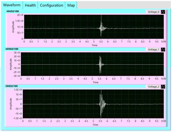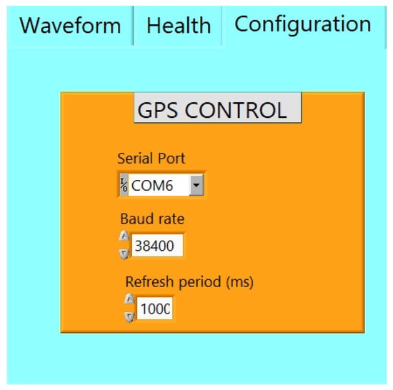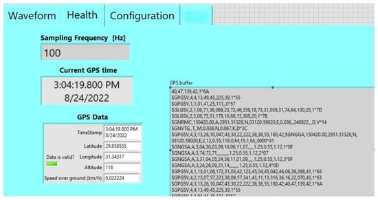 A user-friendly interface for monitoring and controlling the proposed system has been built using LABVIEW (version 21) program. This graphical user interface (GUI) software is divided into three tabs. Firstly, the waveform tab shows the real-time waveform recorded from three sensor channels, as shown in Figure 6. Secondly, the health tab indicates the GPS information and other information related to the seismic data such as the used sampling rate. The GPS information declares whether the GPS status is locked or unlocked, and the location information includes the latitude and longitude coordinates and the current GPS time and date, as illustrated in Figure 7. Finally, Figure 8 shows the configuration tab, by which the user can control the settings of the parameters of the ADC and the GPS receiver. Thus, the user can configure the system parameters easily. Moreover, the real-time waveform can be monitored for ground motion and the GPS information.
