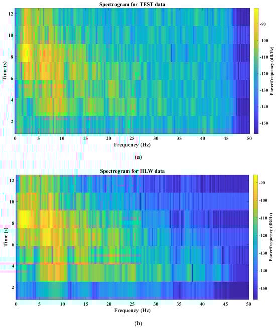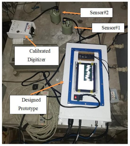 Figure 15 compares the spectral analysis between the prototype and the commercial digitizers, which is called a spectrogram. The spectrogram is a graph that shows, for a given frequency range, the strength of a signal over time. It displays the energy variation over time and indicates the frequencies where the signal is strongest using a color spectrum. Most of signal power is concentrated from 0 Hz to 25 Hz, with yellow color and a value of about −90 dB, as illustrated in Figure 15a,b. After that the power is decreased in the two figures, with dominant blue color ranging from −130 dB to −155 dB. However, the TEST data for the prototype digitizer after 25 Hz has an increase in signal power by about −20 dB compared to the calibrated digitizer. the probable cause behind this extra power is an unwanted high frequency noise resulting from an electromagnetic interference. The connections between the sensor and the analog-to-digital converter (ADC) should be well shielded. Although there was noise, primary (P) and secondary (S) waves were clearly captured with different amplitudes, and when compared to the data coming from the commercial system, it was discovered to be inconsiderable.