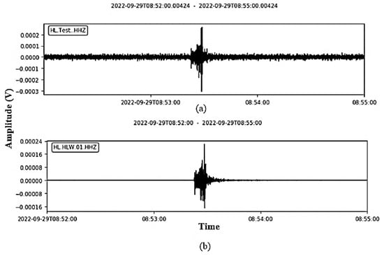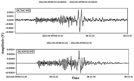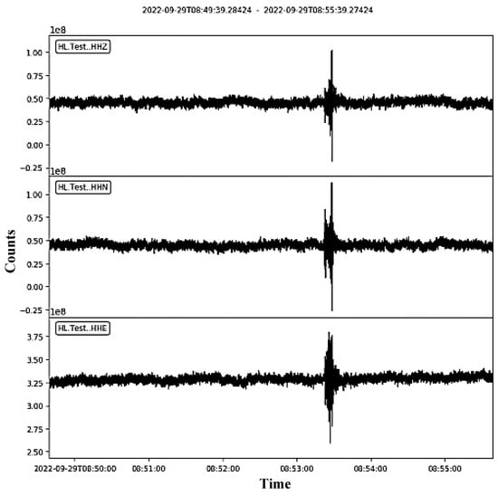 Numerous experimental sets of data are acquired and one example is shown in Figure 10. This example demonstrates that the test station records an event in three directions (Z, N, and E). The events occurred on 29 September 2022, at about 08:53:20.