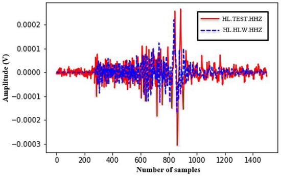 Figure 12 displays the event after enlarging the interval of the event only. Certainly, the two waveforms are not totally identical, which is a result of the difference between the used ADC and the multistage decimation filter design. However, the event arrival time and the amplitude are approximately the same. These two parameters are mainly used in the event solution. Furthermore, the two waveforms are drawn in the same figure to determine the deviation between the prototype digitizer and the calibrated digitizer, as shown in Figure 13. This figure illustrates the correlation between the waveform of the two devices in the Z-direction given the same number of samples.