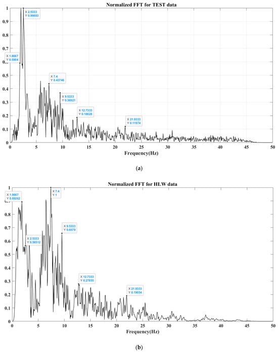 Regarding to frequency domain analyses, the normalized fast Fourier transform (FFT) and spectrogram are investigated in Figure 14 and Figure 15. The frequency distribution of the 29 September 2022, 08:53:20 GMT event is shown in Figure 14a for the prototype station and Figure 14b for the calibrated digitizer. There is a remarkable similarity found. Specifically, the frequency contents have a considerable increase between 0 Hz and 25 Hz, with represented peaks at 1.8 Hz, 2.5 Hz, 7.4 Hz, 9.5 Hz, 12.7 Hz, and 21.9 Hz. Then, frequency values have a constant reduction behavior until 45 Hz.