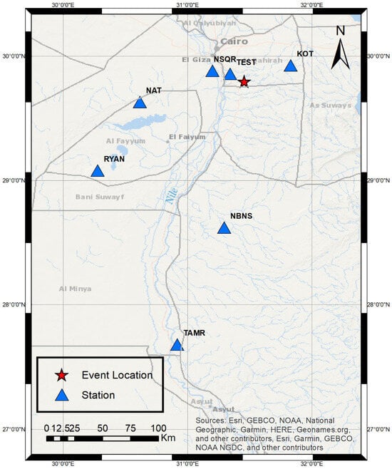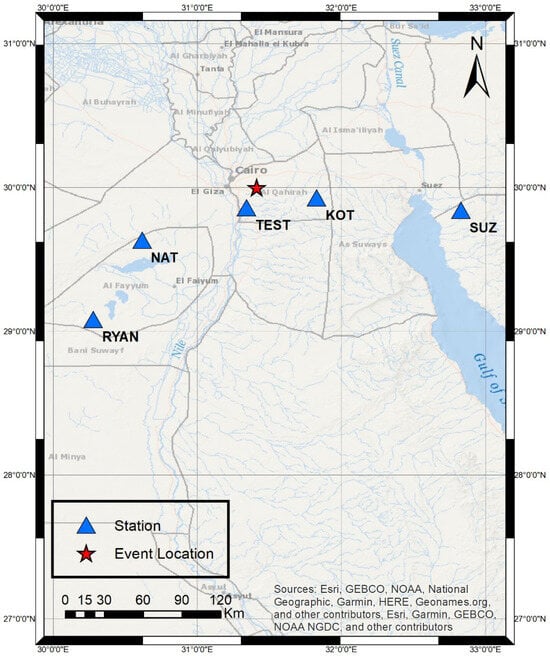 In this case study, an explosion occurred on 11 September 2022 near Helwan city, as shown in Figure 16. The start time of the event was nearly 7:35:14 in GMT time zone. This event was recorded at Cairo network stations. This network consists of six stations: Kottamia (KOT) station, which is located in the northeast of Cairo. The southwest stations of Cairo are New Saqqara (NSQR), Wadi El-Ryan (RYAN), and Wadi el Natrun (NAT). Finally, the New Ben Suif (NBNS) and Tell El-Amarna (TAMR) stations are located in the west of Cairo.