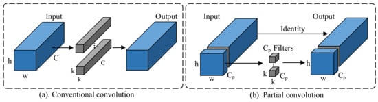 PConv has smaller compared to conventional convolution operations. Assuming the convolution operation uses kernels with the same length and width. Based on the Equation (1), it can be concluded that if the the number of channels processed in the PConv is only half of the original number of channels, the will also be reduced by half. This significant reduction not only reduces the computational cost, but also increases the processing speed, making PConv particularly suitable for application scenarios with limited computational resources.