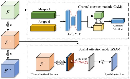 CBAM calculates attention matrices in both channel and spatial dimensions and then multiplies these attention matrices with the input feature maps for adaptive feature learning, the specific structure is shown in Figure 4. If the input feature map is denoted as , and the channel and spatial feature extraction modules are represented as and , respectively, then the overall feature extraction process can be described as Equation (2):
