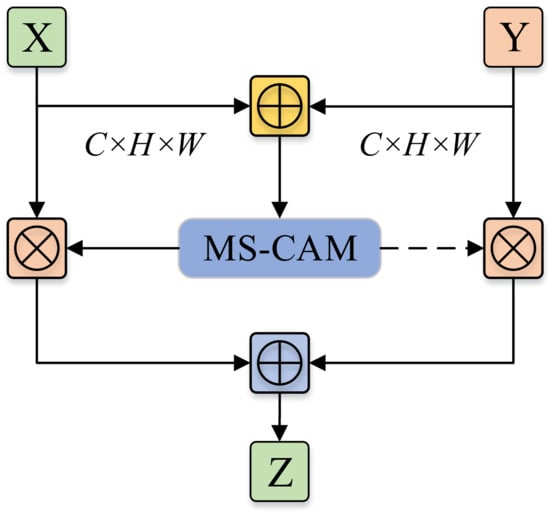 In the scene of feature fusion, given two feature mappings X and Y, and assuming Y is the feature mapping with a larger receptive field, then the MS-CAM-based AFF working mechanism can be described as Equation (8); the structure is shown in Figure 6.
