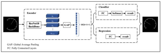 After experimental testing, the CNN network does not regress well to predict the angle of rotation of the dial image after segmentation from 0 to 360°. The reason for this is that the dial image can be largely regarded as an axisymmetric figure. And after a segmented image is symmetrical, the results differ greatly when the features are roughly similar, leading to the fact that the convolutional neural network does not deal with this situation well. To solve this problem, a new branch of classification is added to classify clockwise and counterclockwise rotations of the image, while the regression branch only needs to deal with the 0–180° case. Considering the need to balance the accuracy of the model and its lightweight, ResNet18 is used as the feature extraction part to design the rotation correction network. At the same time, the idea of migration learning is integrated to accelerate the convergence of the model. The network structure is shown in Figure 7.