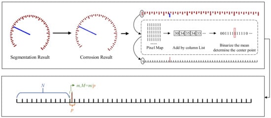 Firstly, the rotationally corrected dial is corrupted to make the boundary between the segmented scales more obvious. Then, the annular scale is expanded into a rectangle using polar coordinate transformation. Afterwards, the two-dimensional scale is compressed into a one-dimensional sequence using a projection-like method, and then the sequence needs to be binarized, which can eliminate some small pixel errors caused by segmentation or image deformation, and also obtain a clearer distribution of the scale. Then, traverse the binary sequence and take the center of each pixel block to represent its position in the one-dimensional sequence. This provides the relative positions of all scales and pointers, which can be used to calculate the final reading in the next step.