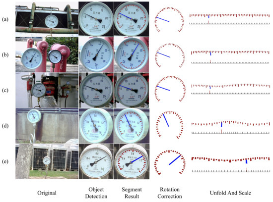 From Figure 11, it can be seen that the first column is the original image. The second column is the dial obtained after object detection algorithm. The third column is a mixture of the semantic segmentation result and the dial. The fourth column shows the segmented image after angle correction. The fifth column shows the rectangular scale graph formed after polar coordinate transformation of the segmentation result, and the standard scale graph generated on this basis. Row (a) shows the ideal case: the meter is facing the camera, and at this time, which is after the reading process, the results can be accurately obtained. Row (b) shows the dial that has been rotated. Rows (c), (d), and (e) show the dial in the case of perspective angle changes.