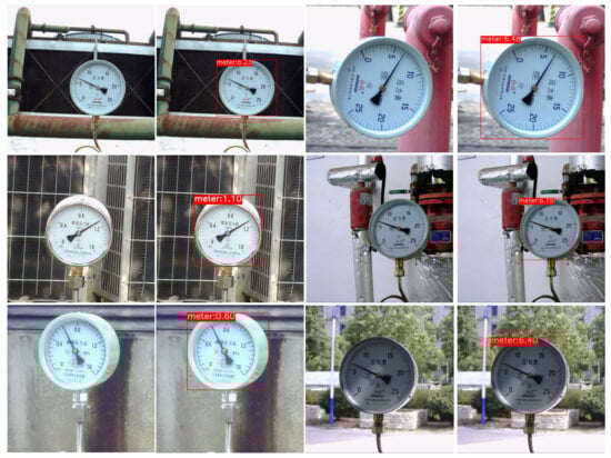 Our experimental environment is an Ubuntu system with Intel Xeon Silver 4214R @ 2.40 GHz CPU, 128 GB RAM, and a graphics card GeForce RTX 4080. The model is trained with an initialized learning rate set to 0.001, a batchsize of 8, and 200 training rounds. The experimental dataset was self-collected on the Internet and consisted of 920 images under different meter types, backgrounds, lighting, and distances. Part of the data are shown in Figure 9. Each of these columns represents a type of meter; they have different shapes and scale values. Each row shows a different scene.