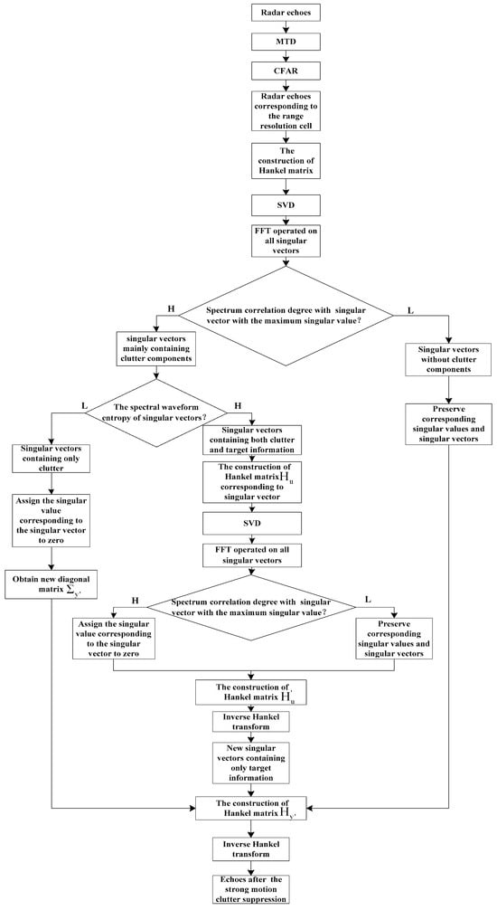 To preserve target micro-motion information, spectral waveform entropy is used as a quantitative evaluation index for extracting singular vectors containing both clutter and target information. This spectral correlation characteristic is then utilized again to suppress the strong motion clutter component in singular vectors containing both clutter and target information. Then, new singular vectors containing only target information can be obtained. Finally, by selecting different singular values and singular vectors corresponding to the target and clutter, the new Hankel matrix is reconstructed. The inverse Hankel transform is subsequently applied to obtain the target components. A block diagram of the proposed method is shown in Figure 2.
