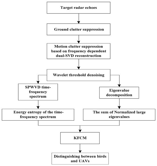 After suppressing strong moving clutter, considering that energy entropy is easily affected by noise, the wavelet threshold denoising (WTD) method is used to denoise the radar echoes. In this method, the wavelet coefficients corresponding to the signal components are larger, while those corresponding to the noise components are much smaller. By selecting an appropriate threshold, the wavelet coefficients below this threshold are set to zero, and wavelet reconstruction is performed to obtain the denoised signal . Feature extraction is then carried out, and the identification of birds and UAVs is achieved using the KFCM method. The flowchart for identifying birds and UAVs is shown below. See Figure 3.