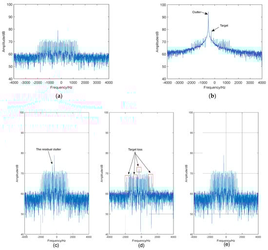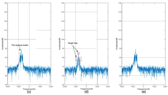Clutter suppression results of a UAV target. (a) The spectrum of the received signal without clutter. (b) The spectrum of the received signal with clutter. (c) The spectrum after clutter suppression (FODS-SVD method). (d) The spectrum after clutter suppression (FEMP-SVD method). (e) Spectrum after clutter suppression (the proposed method).