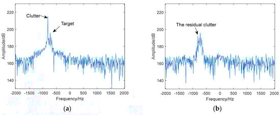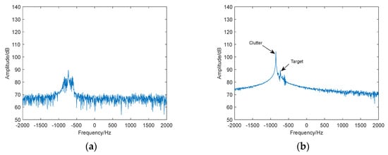 Based on the above parameters, by using the model that combines the movement characteristics of birds and the transmission characteristics of radar electromagnetic waves described in reference [36] and the scattering point superposition model described in reference [37], the spectrum of the received data without clutter is shown in Figure 4a and Figure 5a. The spectrum of the received data with clutter is shown in Figure 4b and Figure 5b. In the strong motion clutter environment (that is, the plane echoes), the target is essentially covered and cannot be detected. The results after clutter suppression are shown in Figure 4c–e and Figure 5c–e for the FODS-SVD method, the FEMP-SVD method, and the proposed method, respectively.