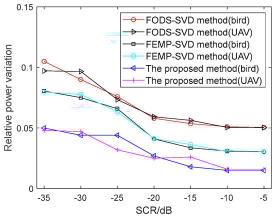 where is the amplitude of the bird or UAV target without clutter and is the signal amplitude of the bird or UAV after clutter suppression. The smaller the variance, the better the performance of the clutter suppression method. The relative power variations for the proposed method, the FODS-SVD method, and the FEMP-SVD method are shown in Figure 6. Using 200 sets of Monte Carlo experiments for each signal-to-clutter ratio, with each set containing 200 bird samples and 200 UAV samples, it can be observed that the relative power variance decreases and then tends to stabilize as the SCR increases.