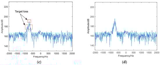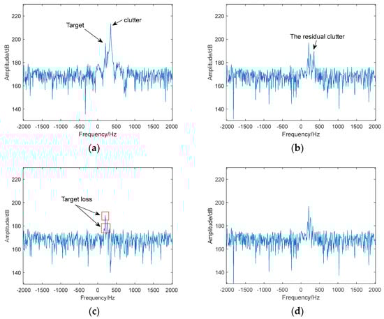 Clutter suppression results of the UAV target. (a) The spectrum of the received signal. (b) Spectrum after clutter suppression (FODS-SVD method). (c) Spectrum after clutter suppression (FEMP-SVD method). (d) Spectrum after clutter suppression (the proposed method).