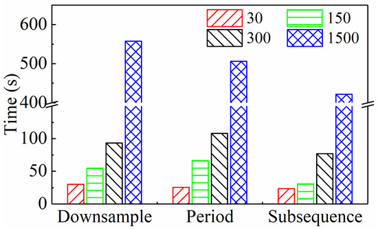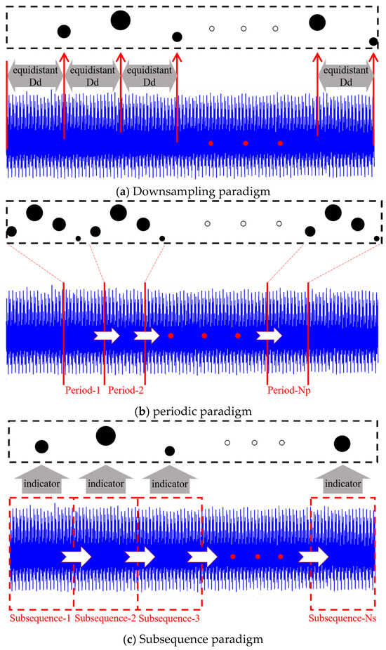 Downsampling is a well-established strategy that addresses large-scale datasets, reducing data scale and preventing the loss of key features [44,53,55]. Figure 2a illustrates its basic principle. The original data are processed at equal intervals of , meaning one sampling point is retained for every sampling points, sequentially generating a new series. The downsampling rate then is the reciprocal of . If the length of the original signal is , then the length of the newly generated series is . In the following, the downsampling paradigm processed at equal intervals of will be denoted as downsampling-.