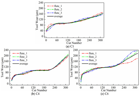 Each tool underwent 315 milling operations in total. The Leica MZ12 microscope was used to measure the wear values of the three cutting flutes of the milling tool offline as the tool completed the end milling of 108mm along the x-direction. Although the machining signals of 6 tools were collected during the experiment, only the wear values of tools C1, C4, and C6 were measured. Therefore, the signal data of these three tools were selected as the dataset for this study. According to the recommendation of ISO 8688-2 (1989) [65], the average wear value of the three cutting edges is taken as the actual wear value of the tool, as shown in Figure 4.
