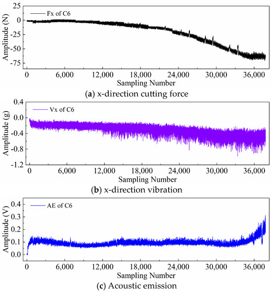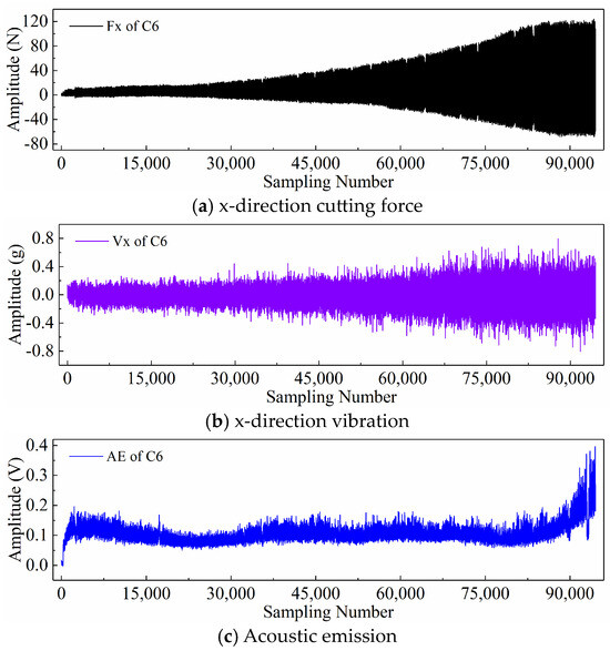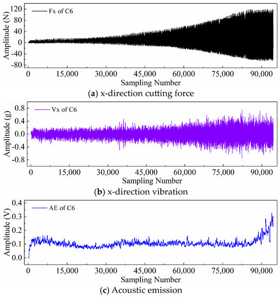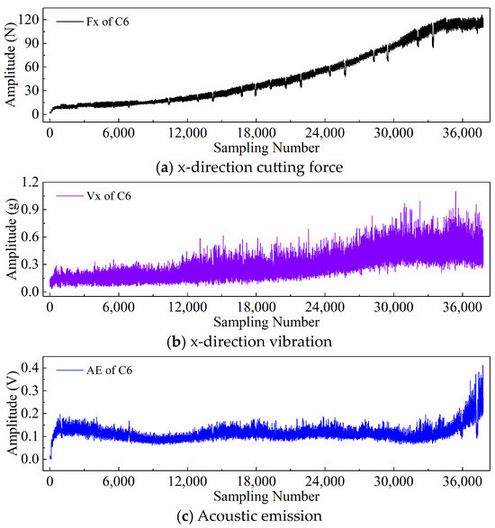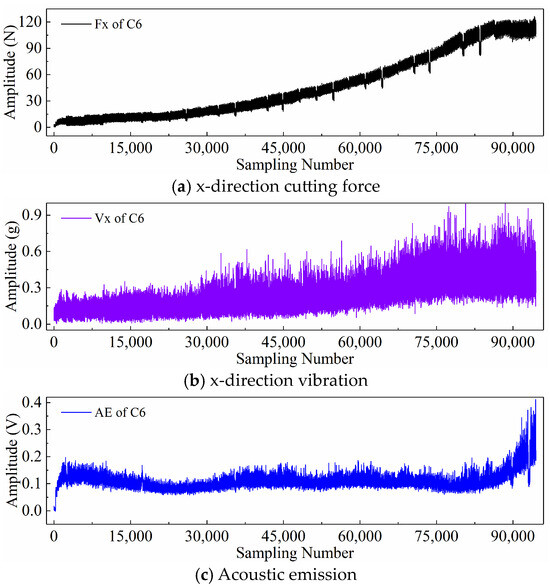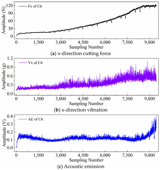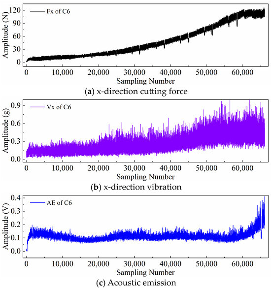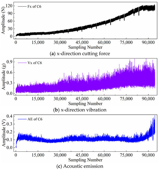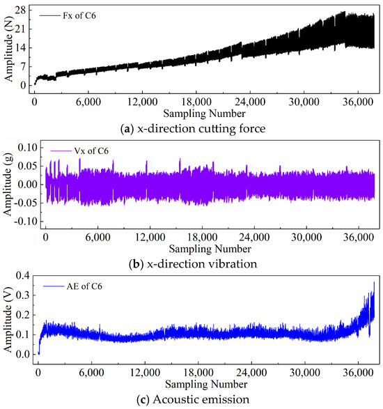 Table 1 lists the detailed experimental conditions. In each machining process, the spindle speed was set to be 10,400 r/min; the feed rate in the x-direction was set to be 1555 mm/min; the cutting depth in the y-direction was set to be 0.2 mm; and the cutting depth in the z-direction was set to be 0.125 mm. In order to collect the signals of the tool in real time during the machining process, a Kistler 9265B three-way dynamometer is installed between the table and the workpiece to collect the cutting force signals in x-, y-, and z-directions. Three Kistler 8636C piezoelectric acceleration sensors were mounted on the workpiece to collect vibration signals in three directions. At the same time, a Kistler 8152 acoustic emission sensor mounted on the workpiece was used to collect the high-frequency stress waves generated by the cutting process. As a result, seven channels of analog signals were collected and subsequently converted to digital signals by a DAQ NI PCI1200 acquisition card with a sampling frequency of 50 kHz.