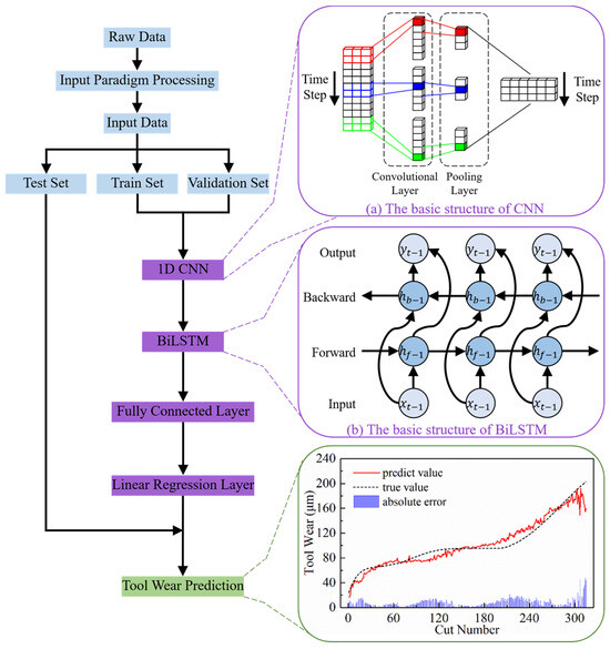 As mentioned in the Introduction, the latest trend in TCM research is to look into hybrid models that combine CNNs and RNNs. This is because there is a complex spatiotemporal correlation between the multi-channel sensor signal data collected during the tool machining process and tool wear. To this end, this paper designs a CNN-BiLSTM model that combines a one-dimensional CNN (1D CNN) and bidirectional LSTM (BiLSTM), with the corresponding framework shown in Figure 9.