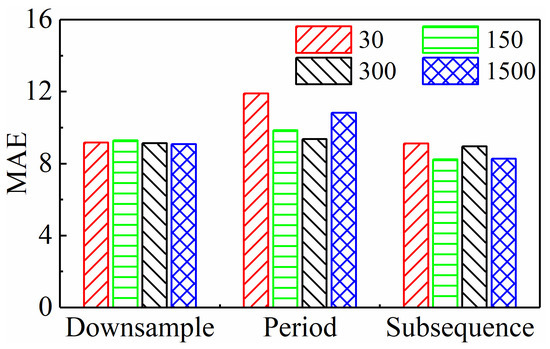 The comparison in the previous section was based on the same input sequence length (300), thus providing only a preliminary conclusion. As stated in the Introduction, one of the starting points of this paper is to investigate how to minimize the scale of input data while ensuring predictive performance. Therefore, it is necessary to explore the performance of different input paradigms when the input sequence length changes, in order to clarify their potential for reducing dimensionality. Obviously, with the decrease in input sequence length, if the model’s performance improves, it indicates that the input paradigm’s dimensionality reduction potential is high. Therefore, this paper selects different sequence lengths of 30, 150, 300, and 1500 and accordingly adjusts the parameters of the three input paradigms as follows:
