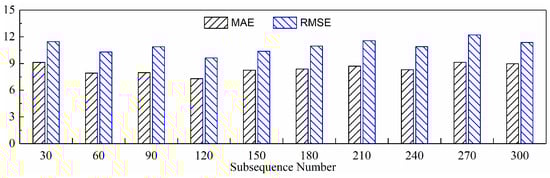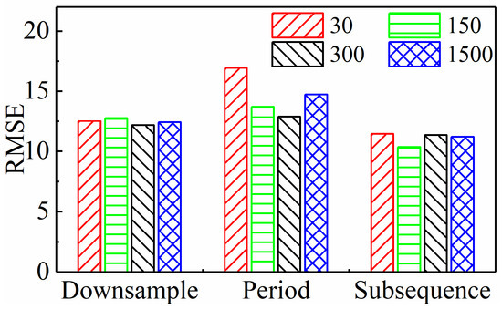 Under all of the above conditions, Table 4 lists the model’s MAE and RMSE on three test sets. To compare the prediction performance more intuitively, the average values of these two indicators under each input paradigm were calculated, as shown in Figure 13 and Figure 14, respectively. For the downsampling paradigm, the model’s MAE and RMSE do not change much as the sequence length goes down. This means that the model’s performance does not change much as the sequence length goes down. This might be because the original data had a high sampling frequency. For the periodic paradigm, as the sequence length decreases, the time series features contained within the sequence are reduced and even no longer reflect a complete period, resulting in a deterioration of the model performance. Thus, for any input sequence length, its MAE and RMSE are the largest among these three paradigms. However, for the subsequence paradigm, its MAE and RMSE are lower than those of the other two paradigms, which is mainly attributed to the time series generated by the subsequence paradigm that better maintains the integrity of the original sequence and thereby more effectively retains the feature information of tool wear contained in the original data.