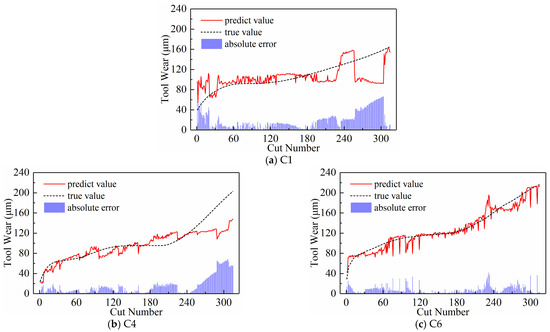 We analyzed the predictive performance of the CNN-BiLSTM model using the new time series generated by the three input paradigms shown in Section 2.3. Note that the newly generated sequences here have a length of 300. The predictive results of the three input paradigms are shown in Figure 10, Figure 11, and Figure 12, respectively, where the red solid line represents the predicted value of tool wear, the black dashed line represents the actual value of tool wear, and the bottom histogram represents the absolute error between the predicted value and the actual value. It is well known that the tool wear process can be divided into three stages: initial wear, normal wear, and severe wear. Overall, the tool wear prediction curves of the three input paradigms to some extent follow the actual wear trend and basically capture the three stages of tool wear. This indicates that the three paradigms designed in this paper are effective in predicting tool wear. In order to further quantitatively analyze the predictive performance of the model, the detailed data of the evaluation indicators are listed in Table 3 below.